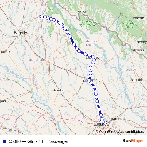 The first stop of the 55086 rail route is Gomti Nagar and the last stop is Pilibhit Jn. 55086 (Gtnr-PBE Passenger) is operational during everyday.