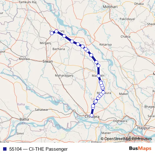 The first stop of the 55104 rail route is Chhapra Kacheri and the last stop is Thawe Jn. 55104 (CI-THE Passenger) is operational during everyday.