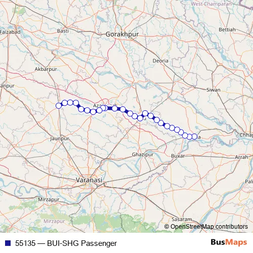 The first stop of the 55135 rail route is Ballia and the last stop is Shahganj Jn. 55135 (BUI-SHG Passenger) is operational during everyday.