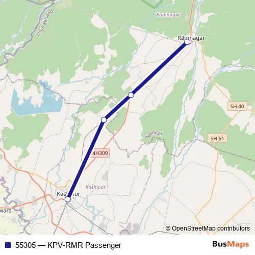 The first stop of the 55305 rail route is Kashipur and the last stop is Ramnagar. 55305 (KPV-RMR Passenger) is operational during everyday.