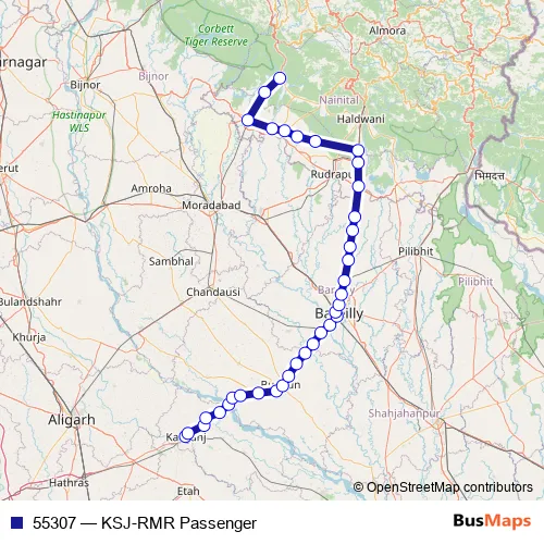The first stop of the 55307 rail route is Kasganj and the last stop is Ramnagar. 55307 (KSJ-RMR Passenger) is operational during everyday.