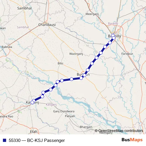 The first stop of the 55330 rail route is Bareilly City and the last stop is Kasganj. 55330 (BC-KSJ Passenger) is operational during everyday.