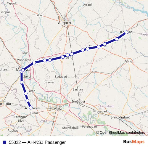The first stop of the 55332 rail route is Achhnera Jn and the last stop is Kasganj. 55332 (AH-KSJ Passenger) is operational during everyday.