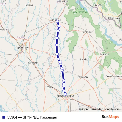 The first stop of the 55364 rail route is Shahjehanpur and the last stop is Pilibhit Jn. 55364 (SPN-PBE Passenger) is operational during everyday.