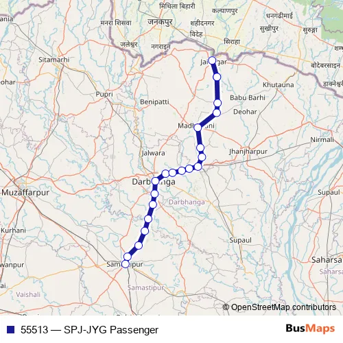 The first stop of the 55513 rail route is Samastipur Jn and the last stop is Jaynagar. 55513 (SPJ-JYG Passenger) is operational during everyday.
