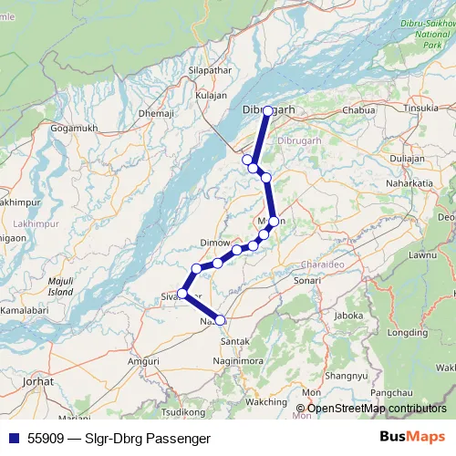 The first stop of the 55909 rail route is Simaluguri Jn and the last stop is Dibrugarh. 55909 (Slgr-Dbrg Passenger) is operational during everyday.
