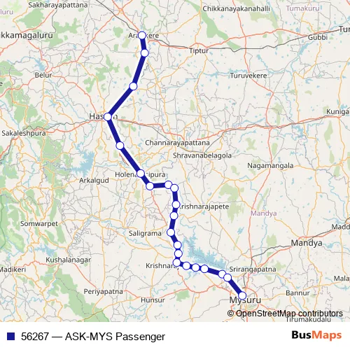 The first stop of the 56267 rail route is Arsikere Jn and the last stop is Mysore Jn. 56267 (ASK-MYS Passenger) is operational during everyday.