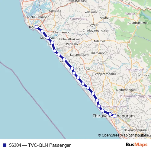 The first stop of the 56304 rail route is Thiruvananthapuram Central and the last stop is Kollam Jn. 56304 (TVC-QLN Passenger) is operational during everyday.