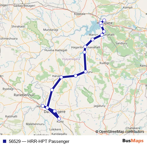 The first stop of the 56529 rail route is Harihar and the last stop is Hosapete Junction. 56529 (HRR-HPT Passenger) is operational during everyday.