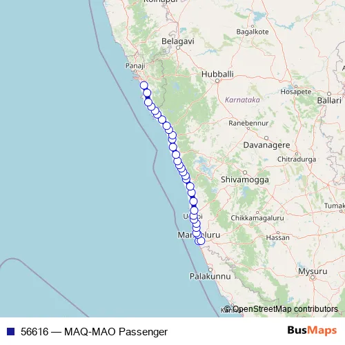 The first stop of the 56616 rail route is Mangalore Central and the last stop is Madgaon Junction. 56616 (MAQ-MAO Passenger) is operational during everyday.