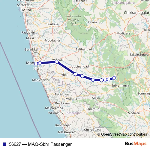 The first stop of the 56627 rail route is Mangalore Central and the last stop is Subrahmanya Road. 56627 (MAQ-Sbhr Passenger) is operational during everyday.