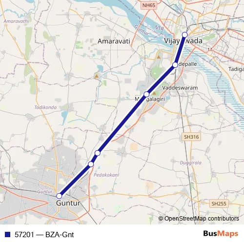 The first stop of the 57201 rail route is Vijayawada Jn and the last stop is Guntur Jn. 57201 (BZA-Gnt) is operational during everyday.