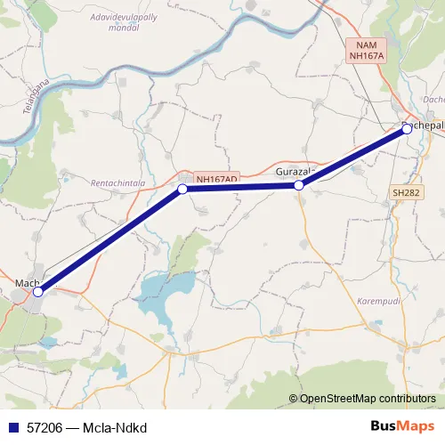 The first stop of the 57206 rail route is Macherla and the last stop is Nadikode. 57206 (Mcla-Ndkd) is operational during everyday.