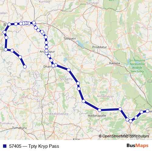 The first stop of the 57405 rail route is Tirupati and the last stop is Kadiridevarapalli. 57405 (Tpty Kryp Pass) is operational during everyday.
