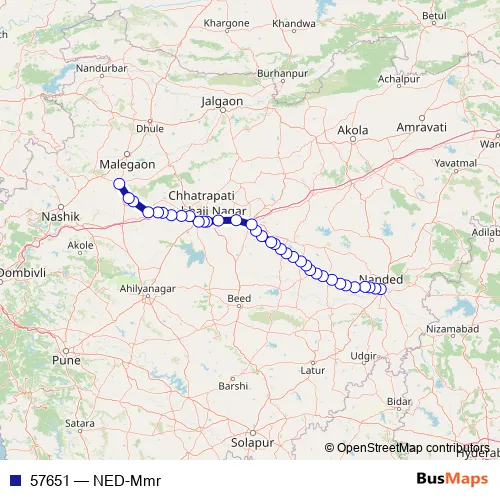 The first stop of the 57651 rail route is Nanded and the last stop is Manmad Jn. 57651 (NED-Mmr) is operational during everyday.