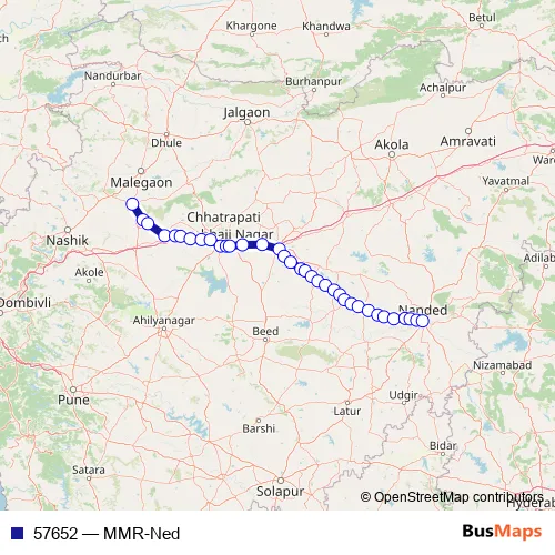 The first stop of the 57652 rail route is Manmad Jn and the last stop is Nanded. 57652 (MMR-Ned) is operational during everyday.