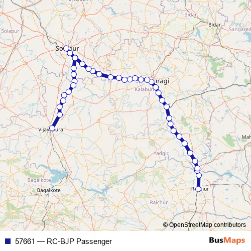 The first stop of the 57661 rail route is Raichur and the last stop is Vijayapura. 57661 (RC-BJP Passenger) is operational during everyday.