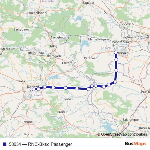 The first stop of the 58034 rail route is Ranchi and the last stop is Bokaro Steel City. 58034 (RNC-Bksc Passenger) is operational during everyday.