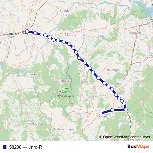 The first stop of the 58208 rail route is Junagarh Road and the last stop is Raipur Jn.. 58208 (Jnrd-R) is operational during everyday.