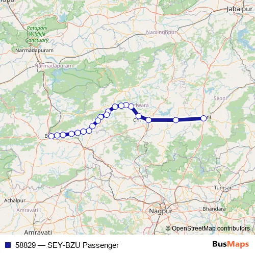 The first stop of the 58829 rail route is Seoni and the last stop is Betul. 58829 (SEY-BZU Passenger) is operational during everyday.