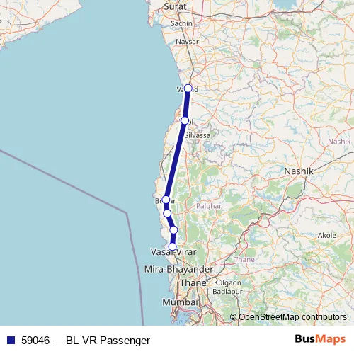The first stop of the 59046 rail route is Valsad and the last stop is Virar. 59046 (BL-VR Passenger) is operational during everyday.