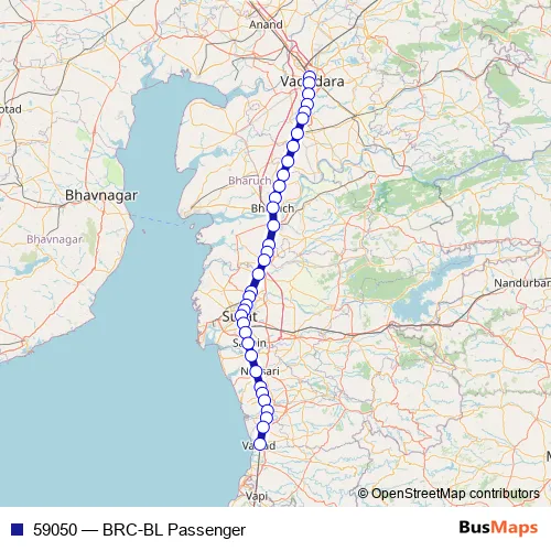 The first stop of the 59050 rail route is Vadodara Jn and the last stop is Valsad. 59050 (BRC-BL Passenger) is operational during everyday.