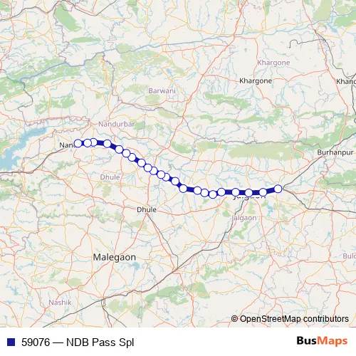 The first stop of the 59076 rail route is Bhusaval Jn and the last stop is Nandurbar. 59076 (NDB Pass Spl) is operational during everyday.