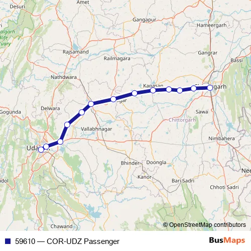 The first stop of the 59610 rail route is Chittaurgarh Jn. and the last stop is Udaipur City. 59610 (COR-UDZ Passenger) is operational during everyday.