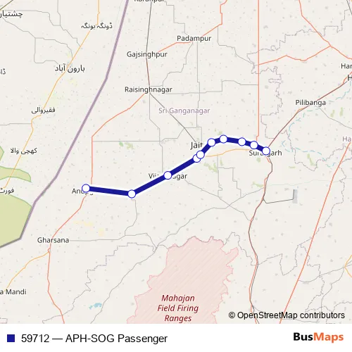 The first stop of the 59712 rail route is Anupgarh and the last stop is Suratgarh Jn. 59712 (APH-SOG Passenger) is operational during everyday.