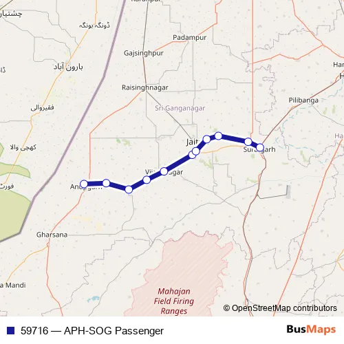 The first stop of the 59716 rail route is Anupgarh and the last stop is Suratgarh Jn. 59716 (APH-SOG Passenger) is operational during everyday.