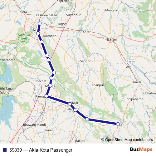 The first stop of the 59839 rail route is Aklera and the last stop is Kota Jn. 59839 (Akla-Kota Passenger) is operational during everyday.