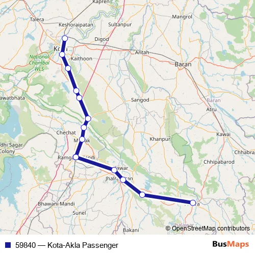 The first stop of the 59840 rail route is Kota Jn and the last stop is Aklera. 59840 (Kota-Akla Passenger) is operational during everyday.