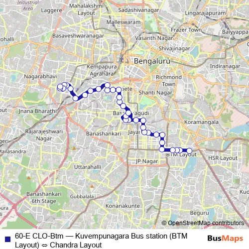 Click here to view the nearest 60-E CLO-Btm - Kuvempunagara Bus station (BTM Layout) ⇔ Chandra Layout bus stop.