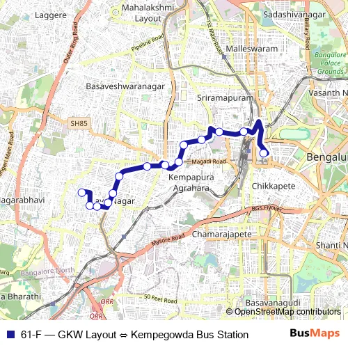 The first stop of the 61-F bus route is GKW Layout and the last stop is Kempegowda Bus Station. 61-F (GKW Layout ⇔ Kempegowda Bus Station) is operational during everyday.