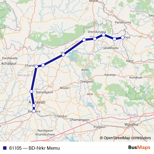 The first stop of the 61105 rail route is Badnera Jn. and the last stop is Narkher. 61105 (BD-Nrkr Memu) is operational during everyday.