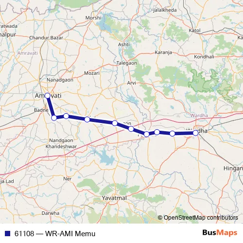 The first stop of the 61108 rail route is Wardha Jn and the last stop is Amravati. 61108 (WR-AMI Memu) is operational during everyday.