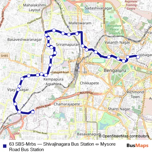 The first stop of the 63 SBS-Mrbs bus route is Shivajinagara Bus Station and the last stop is Mysore Road Bus Station. 63 SBS-Mrbs (Shivajinagara Bus Station ⇔ Mysore Road Bus Station) is operational during everyday.