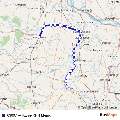 The first stop of the 63007 rail route is Katwa and the last stop is Rampur Hat. 63007 (Kwae-RPH Memu) is operational during everyday.