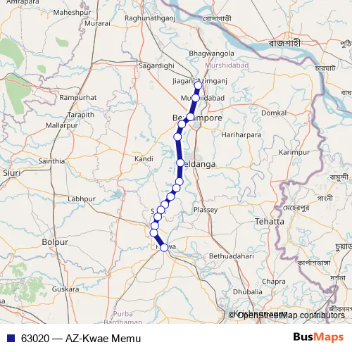 The first stop of the 63020 rail route is Azimganj Jn and the last stop is Katwa. 63020 (AZ-Kwae Memu) is operational during everyday.