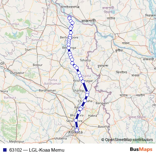 The first stop of the 63102 rail route is Lalgola and the last stop is Kolkatta Terminal. 63102 (LGL-Koaa Memu) is operational during everyday.