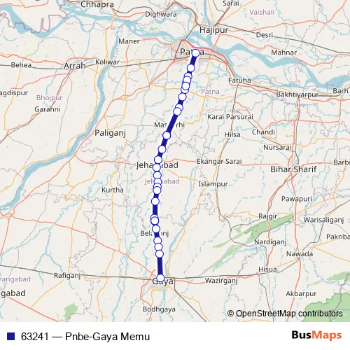 The first stop of the 63241 rail route is Patna Jn and the last stop is Gaya Jn. 63241 (Pnbe-Gaya Memu) is operational during everyday.
