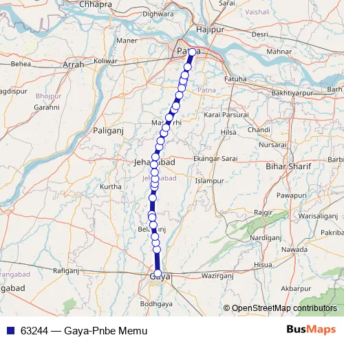 The first stop of the 63244 rail route is Gaya Jn and the last stop is Patna Jn. 63244 (Gaya-Pnbe Memu) is operational during everyday.