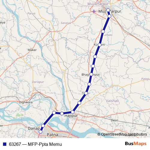 The first stop of the 63267 rail route is Muzaffarpur Jn and the last stop is Patliputra. 63267 (MFP-Ppta Memu) is operational during everyday.