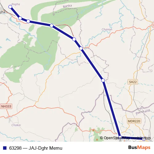The first stop of the 63298 rail route is Jhajha and the last stop is Deoghar. 63298 (JAJ-Dghr Memu) is operational during everyday.