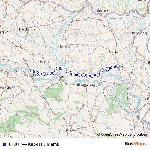 The first stop of the 63301 rail route is Katihar Jn and the last stop is Barauni Jn. 63301 (KIR-BJU Memu) is operational during everyday.