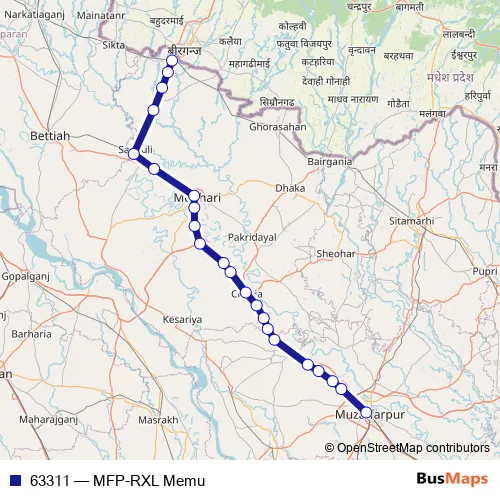 The first stop of the 63311 rail route is Muzaffarpur Jn and the last stop is Raxaul Jn. 63311 (MFP-RXL Memu) is operational during everyday.