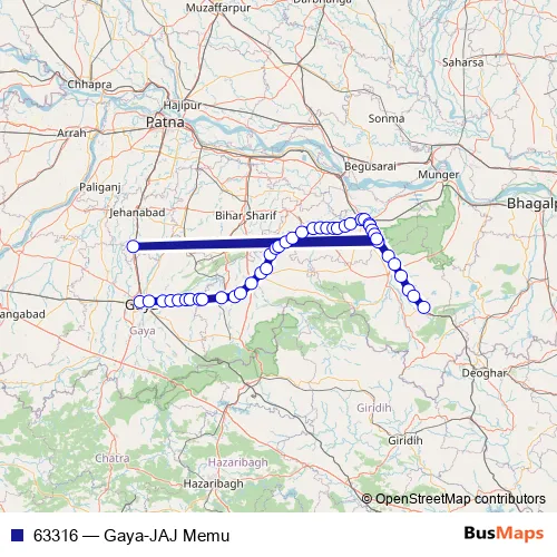 The first stop of the 63316 rail route is Gaya Jn and the last stop is Jhajha. 63316 (Gaya-JAJ Memu) is operational during everyday.
