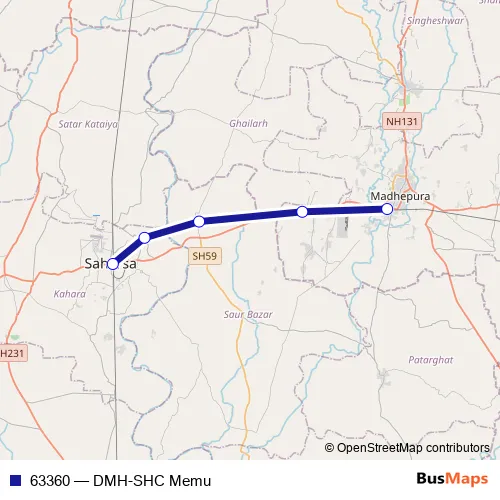 The first stop of the 63360 rail route is Dauram Madhpura and the last stop is Saharsa Jn. 63360 (DMH-SHC Memu) is operational during everyday.