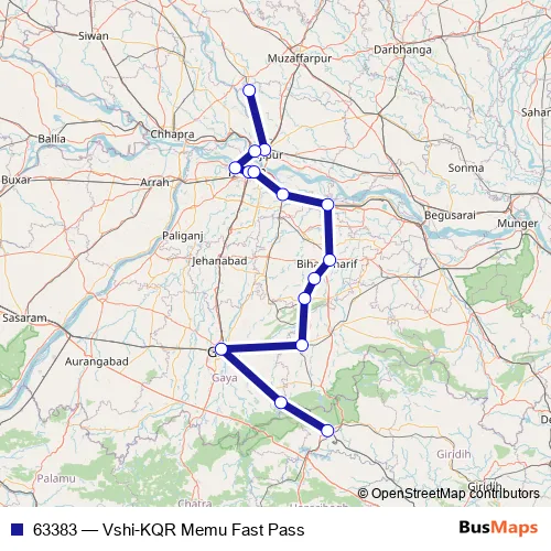 The first stop of the 63383 rail route is Vaishali and the last stop is Koderma. 63383 (Vshi-KQR Memu Fast Pass) is operational during on weekends.