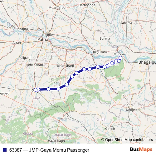 The first stop of the 63387 rail route is Jamalpur Jn and the last stop is Gaya Jn. 63387 (JMP-Gaya Memu Passenger) is operational during everyday.